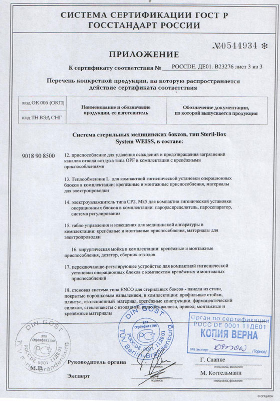 - Сертификат соответствия на систему медицинских стерильных боксов «ВАЙСС», прил.3