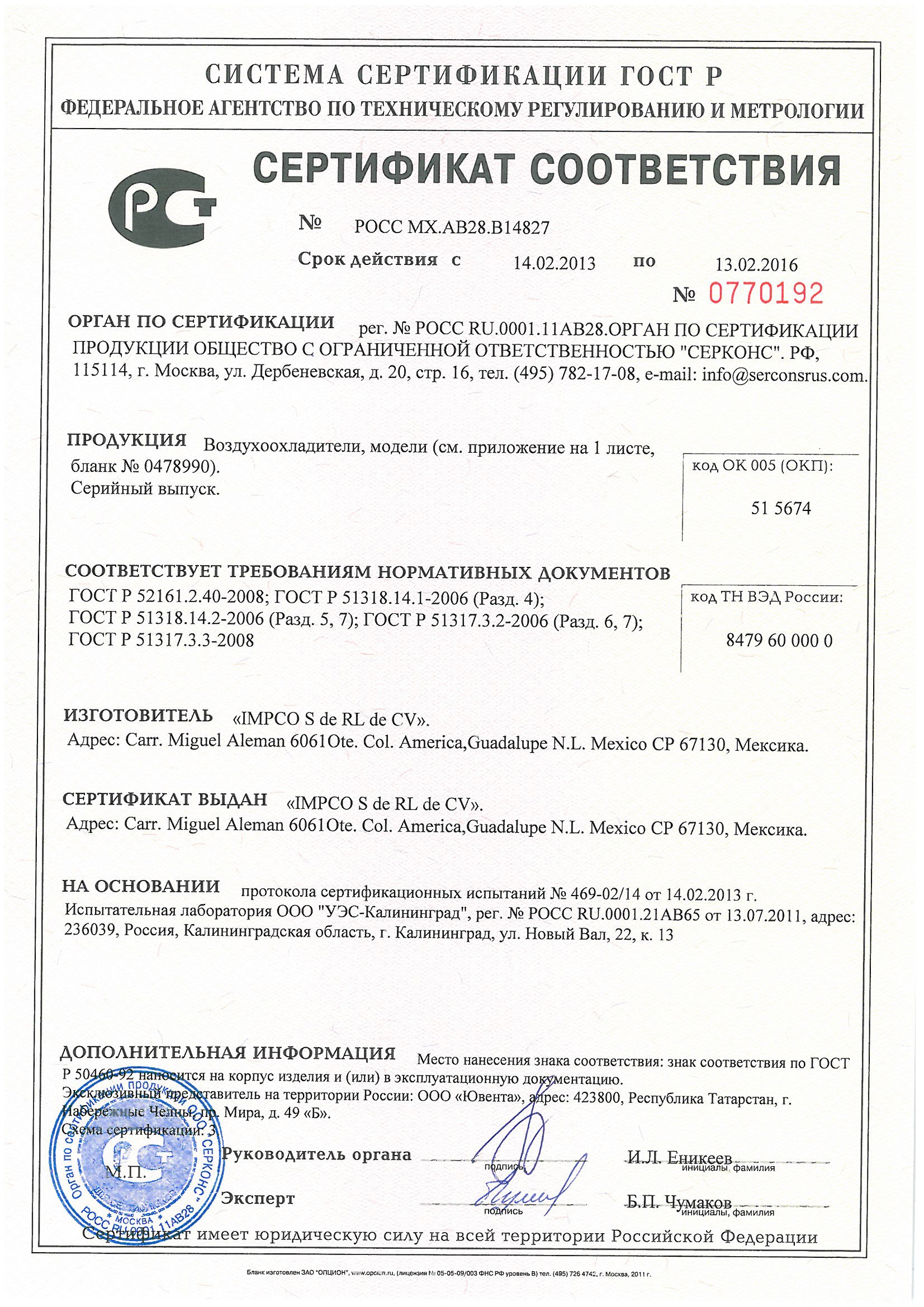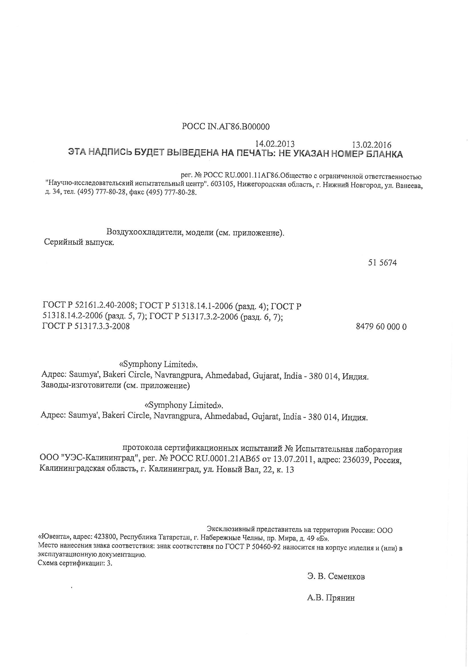 Сертификат соответствия на воздухоохладители торговой марки Symphony