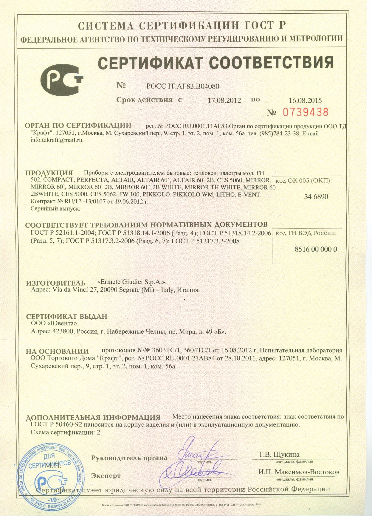 Сертификат соответствия на отопительные приборы торговой марки Aurora