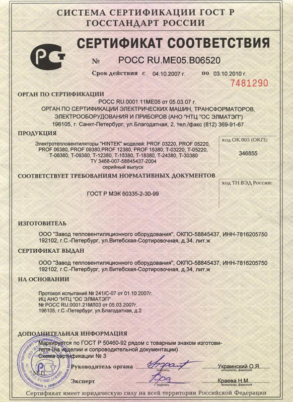 Сертификат соответствия Госстандарта России на тепловентиляторы Hintek