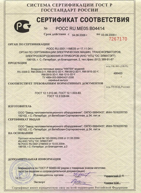 Сертификат соответствия Госстандарта России на тепловые завесы Hintek