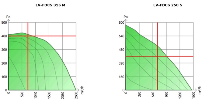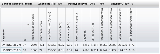 Для примера в программе онлайн подбора вентиляторов LESSAR осуществим подбор вентиляторов на 750 м³/ч и 400 Па. Программа сортирует вентиляторы по максимальному приближению рабочей точки к кривой. Сравнение будем производить между двумя вентиляторами LV-FDCS серии Rational Solutions.