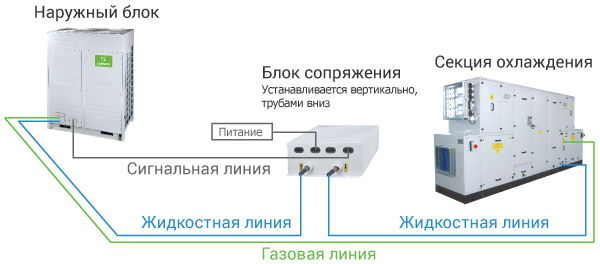 В комплект контроллера входят платы управления клапанами EXV, сами клапаны EXV, датчики температуры и пульт управления в управляющем ящике. Комплект LZ-AHU позволяет работать установке как на охлаждение, так и на обогрев. Включение и отключение осуществляется через контакты на плате управления (для включения или выключения требуется команда с контроллера вентустановки).