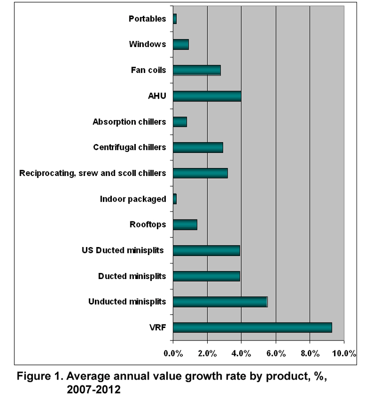 В отличии от сплит-систем, на международном рыннке VRF-систем наблюдается рост на 8% и в денежном, и в количественном выражении. Этот рост можно объяснить ранее запланированными проектами, т.е. рынок VRF ещё не начал ощущать на себе весь эффект от экономического спада. Однако и здесь в 2009 году картина вырисовывается не очень радужная - новые проекты просто не стартуют. Безоговорочно лидирует по продажам Азиатско-тихоокеанский регион - 62% в денежном выражении.