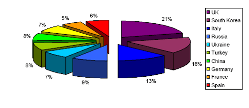 Китай, несомненно, имеет самый высокий уровень продаж на рынке промышленных котлов по сравнению с другими странами. Однако продажи снижаются, и в ближайшие 3 года прогнозируется их дальнейшее падение. В Японии, Иране, Германии и Великобритании уровень продаж довольно высок, однако, все эти 4 страны пережили снижение продаж после 2008 года. После 2010 года ожидается рост и достижение уровня продаж 2008 года в 2012 году.