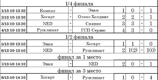 Таким образом, Арктика отчасти реабилитировалась за отсутствие очков на групповом этапе. В других матчах четвертьфинала Danfoss обыграл команду генеральных директоров СЕО 2:0, Clivet не оставил шансов НИИ ГП 3:0, а Вент-Интер Групп, также не набравший ни одного очка в группе, переиграл BDR Thermea – 2:0. В полуфинале Danfoss, опытный участник турниров, не смог одолеть Clivet, проиграв этой команде с разницей всего в один мяч – 1:2. В другом полуфинале играли две команды, занявшие 4-е места – Арктика и Вент-Интер Групп. Вент-Интер Групп уверенно разгромил Арктику со счетом 5:0. Возможно, такое поражение как-то повлияло на психологическое состояние игроков Арктики, из-за чего в матче за 3-е место Арктика не смогла реабилитироваться за поражение 1:4 от Danfossа – на этот раз минимальное поражение 0:1, и бронзу завоевывает Danfoss. В финале Вент-Интер Групп не смог составить должной конкуренции сопернику по своей группе Clivet – 3:0, второе поражение от этого коллектива и уверенная победа в Серебряном Кубке команды Clivet!
