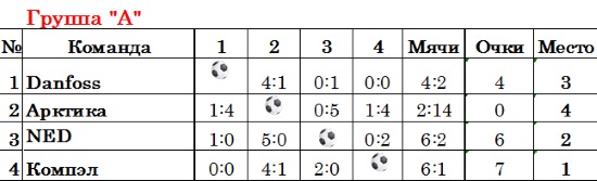 В группе А играли команды Danfoss, Арктика, NED и Компэл. Из этого квартета только Арктика не смогла составить должную конкуренцию своим соперникам, остальные же команды до последнего боролись за выход в «золото». Лидером группы стал Компэл, который оказался одной из трех команд, пропустивших меньше всего мячей в групповом этапе – 1. Нулевая ничья с Danfossом в 3-м туре позволила избежать сравнения разницы мячей между Компэлом, NED и Danfossom: Компэл первый с семью очками, NED – второй с шестью: команда проиграла в первом туре лидеру со счетом 0:2, но обе команды продолжили сражение за Золотой кубок. Арктика и Danfoss отправились в Серебряный плей-офф.