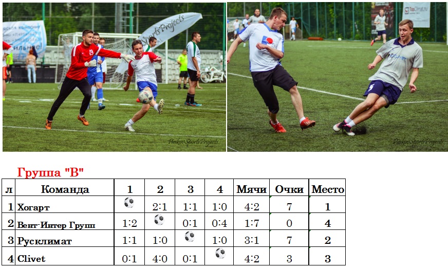 В группе B за попадание в розыгрыш Золотого Кубка сразились команды Хогарт, Вент-Интер Групп, Русклимат и Clivet. Вент-Интер Групп после 2-го тура потерял шансы занять место выше 4-го и третья игра стала для команды простой формальностью, в то время как Хогарт, Русклимат и Clivet до последнего боролись за лидерство. Ничья между Хогартом и Русклиматом и победы этих команд в двух оставшихся матчах принудили считать разницу мячей. При одинаковой разнице +2 на первое место команду Хогарт вывела победа над Вент-Интер Групп с двумя забитыми мячами, Русклимат остался на 2-м месте, но также прошел в розыгрыш Золотого Кубка. Clivet и Вент-Интер Групп продолжили борьбу за Серебряный Кубок.