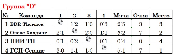 В группе D в борьбу вступили BDR Thermea, Олекс Холдинг, НИИ ТП и ГСП-Сервис. Неудачно выступили игроки НИИ ТП: эта команда не только не набрала очков, но и единственная не смогла забить ни одного мяча на этом турнире. BDR Thermea до последнего тура сохраняла хорошие шансы на выход из группы в Золотой Кубок, но проиграла ГСП-Сервису 0:3. Кстати, именно третий гол ГСП-Сервиса позволил этой команде обойти Олекс Холдинг по разнице мячей на один пункт: при двух победах над остальными соперниками они сыграли между собой вничью 1:1 и набрали по 7 очков. Таким образом, НИИ ТП и BDR Thermea отправились в Серебряный Кубок, Олекс Холдинг и ГСП-Сервис – в Золотой.