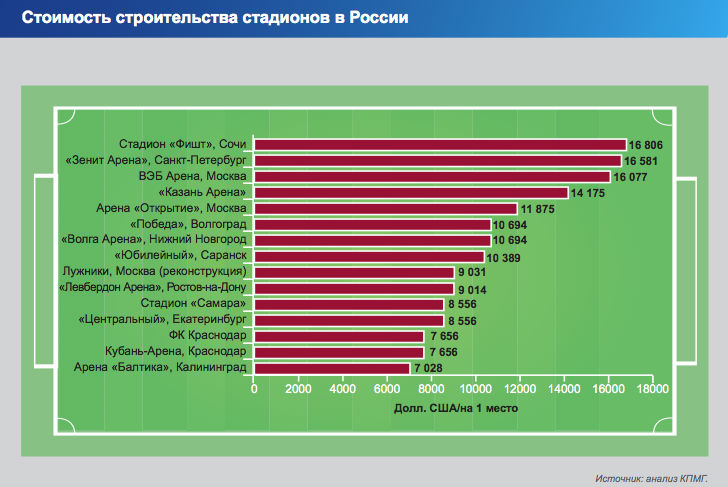Кроме того, строительство стадионов в нашей стране обходится дороже, чем западным соседям. Например, в Европе стоимость одного зрительского места в среднем составляет 4-6 тыс. долларов (минимум — 1,8 тыс., максимум — 14,2 тыс. долларов), а в России оно обходится минимум в 7 тыс. долларов. Одно зрительское место в стадионе «Фишт» по подсчетам аналитиков составило почти 17 тыс. долларов. Сравните с одним из самых дорогих проектов в мире — стадионом Уэмбли, где одно место обошлось в 14 тыс. долларов.