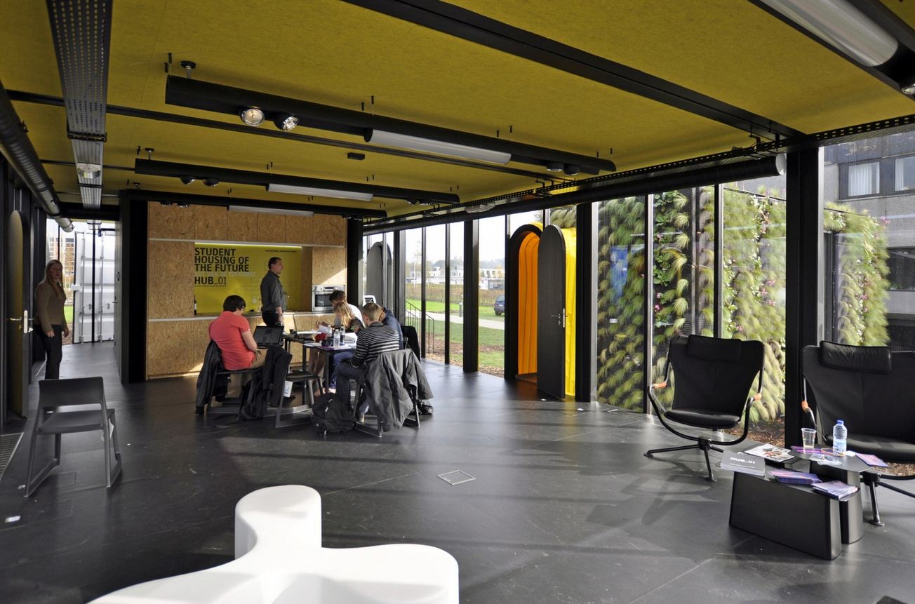 Теперь студенты местного университета будут жить не в огромном общежитии, а в небольших, но отдельных домиках. Каждый из них обладает уникальным дизайном и состоит всего из одной комнаты. Домики соединены с центральным терминалом, оборудованным кухней, санузлом и общей комнатой.