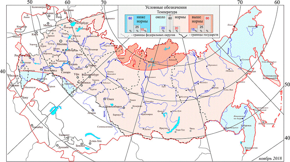 Экстремально низкие температуры в ноябре Гидрометцентр не прогнозирует нигде. Чуть ниже нормы температура окажется на Чукотке, Камчатке, в Приморье, а также в Оренбургской и Астраханской областях и на Кавказе.