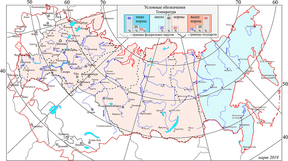 Зато температурный режим марта на всей территории России предполагается близким к средним многолетним значениям, с тенденцией на понижение на Дальнем Востоке.