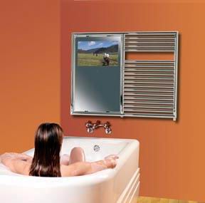Тёплый телевизор-полотенцесушительПарадоксальная новинка — дизайн-радиатор для ванной комнаты со встроенным зеркальным ЖК-телевизором.