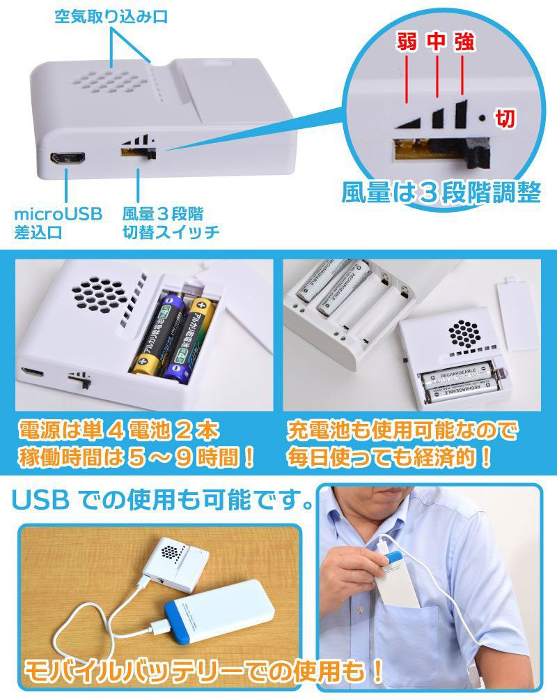 Заряжается оригинальное устройство от внешнего аккумулятора через порт micro-USB или питается при помощи двух батареек типа AAA. Зарядка рассчитана на время работы от пяти до девяти часов, в зависимости от выбора пользователем одной из трех скоростей обдува.