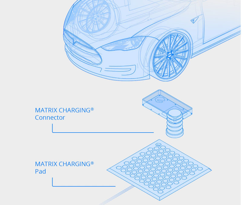 Все, что нужно, чтобы зарядить электромобиль с помощью MATRIX CHARGING, - установить на днище машины специальный коннектор, а на парковке или в гараже, или вообще в любом месте на грунте уложить зарядную панель, представляющую собой двумерную матрицу, состоящую из проводящих элементов гексагональной формы.