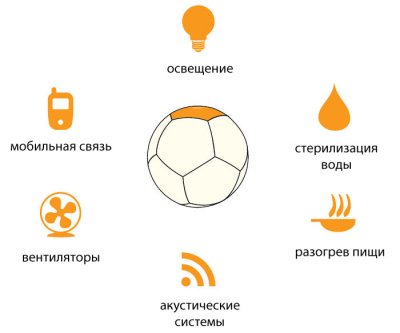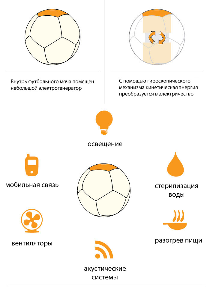 Год назад основатели компании Uncharted Play разработали необычный футбольный мяч. Он состоит из водостойкого материала, а внутри его находится устройство, которое может накапливать энергию и сохранять ее в аккумуляторе. Механизм основан на гироскопах и способен за 30 минут футбольного матча накопить достаточно электричества, чтобы обеспечить работу LED-лампы в течение 3 часов. Мощность мяча — 6 ватт, сообщает energysafe.ru.