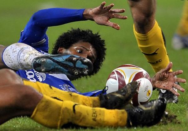 | Бразилец Жо борется за мяч | ...судья не впечатлен | ...команды уходят на перерыв |