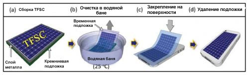 Технология создания самоклеющихся фотоэлементов заключается в следующем. Сначала на жесткую пластину из кремния ученые нанесли слой никеля толщиной 300 нм. Далее был создан фотоэлектрический слой над никелевой пленкой, который покрыли защитной полимерной поверхностью и термической лентой. Чтобы отделить кремниевую пластину, получившийся «сэндвич» поместили в воду, которая просочилась между никелем и кремнием. Термическую ленту нагрели до 90 градусов и оставили при такой температуре на несколько секунд, а затем сняли. А на противоположную от ленты сторону материала нанесли клей.