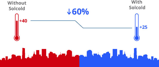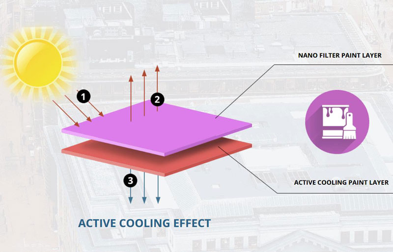Компания Солколд (Solcold) разработала инновационную технологию охлаждения зданий - на поверхность крыши или стен наносится особый двуслойный материал, напоминающий обычную краску, который преобразует тепловое излучение в световое, отражая его и тем самым, охлаждаясь ниже температуры окружающей среды.