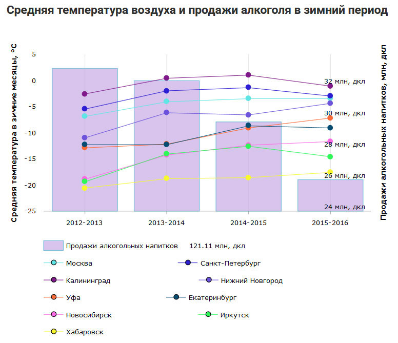 Это дало основание специалистам предположить, что существует зависимость погоды и желания принять дозу алкоголя. Как с юмором отметил директор Центра исследований федерального и региональных рынков алкоголя ЦИФРРА Вадим Дробиз, «русский человек привык спасаться от холода, выпив водки».