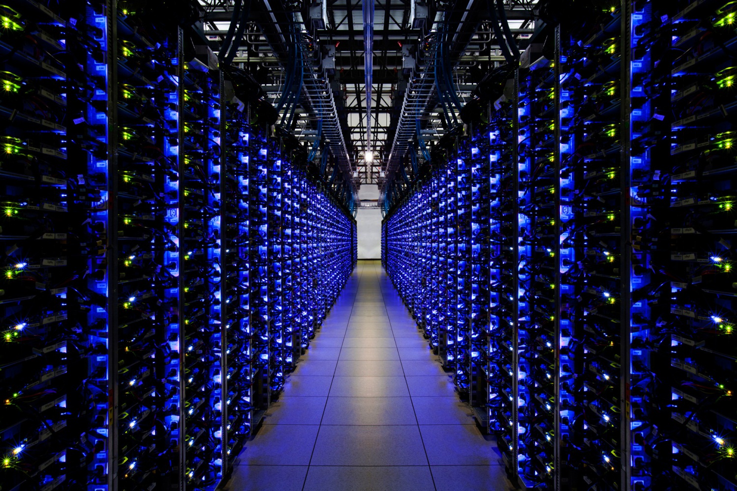Фотограф, запечатлевший святая святых Google — серверные стеллажи в центре обработки данных, признавался, что полученные изображения подвергались существенной обработке на компьютере. Например, одна половина этого фото представляет собой зеркальное отражение другой (присмотритесь к серым блокам наверху и теням от кабелей на полу).В системах «горячий коридор» серверы так же расположены рядами «спина к спине», но в них воздух дует от передней панели сервера к задней стенке. В результате в узком пространстве между рядами серверов образуется «горячий коридор». Считается, что такие системы более эффективны, так как не требуют очень холодного воздуха — достаточно удалить горячий воздух от задней стенки сервера и привести его к комнатной температуре, а затем вернуть обратно к передней панели.