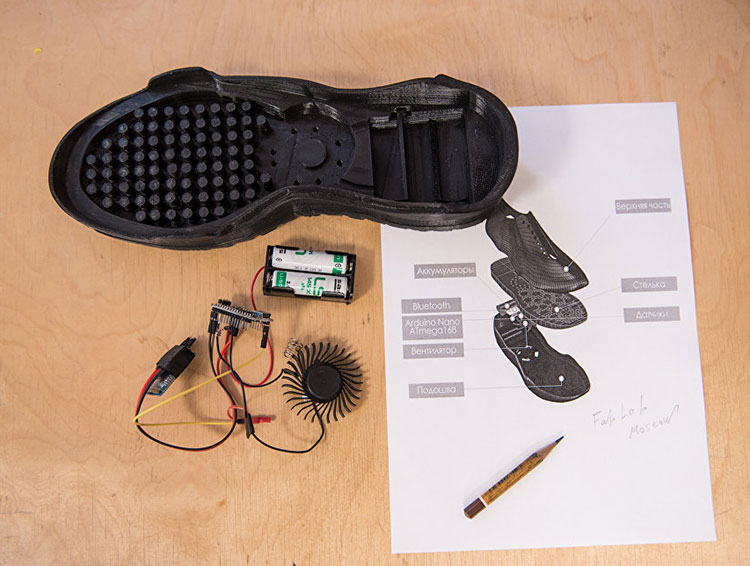 Идея заключается во встраивании в подошву кроссовок охладителя, задача которого состоит в регулировке температуры внутри обуви при изменении температуры наружного воздуха. Конструкция выполнена на основе аддитивных технологий 3D-печати. В корпусе находится батарея питания, системы связи Bluetooth и электронного управления. Управление устройством предполагается осуществлять при помощи смартфона.
