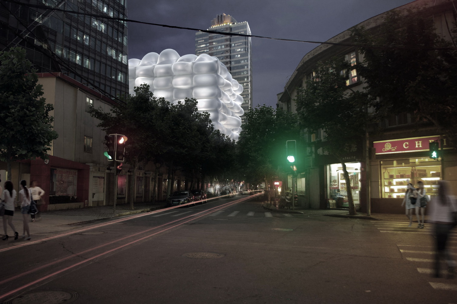Здание-пузырь (Bubble Building) будет построено — если будет — с использованием надувных конструкций, сделанных из белого антибактериального нейлона, установленных перед наружными стенами здания. По словам представителей 3Gatti такой ремонт обычного старого непривлекательного здания не только улучшит общий вид Шанхая, но и поможет держать микробов подальше от офисов.