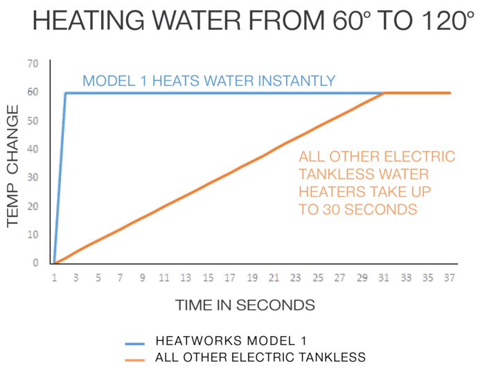 Heatworks Model 1 представляет собой проточный водонагреватель, позволяющий сэкономить до 40% электричества и 10% воды и обеспечить надежную поставку горячей воды даже при слабом напоре. Запатентованная технология «прямого электрического сопротивления», используемая в Heatworks Model 1 использует естественное сопротивление воды, чтобы нагреть ее. Графитовые электроды устройства никогда нагреваются выше, чем окружающая вода, гарантируя контроль температуры, чрезвычайно надежную работу и длительный срок службы. Эта технология эффективно работает даже при напоре от пол-литра в минуту.