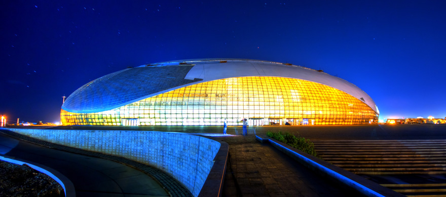 Такие же стекла покрывают верхнюю часть Большой ледовой арены, которая в темное время суток будет превращаться в гигантский телевизор. В купол будут вмонтированы 38 тыс. светодиодов — энергоэффективных и экологически безопасных. Вообще для всех осветительных нужд Олимпийской деревни используются только энергоэффективные лампы, чей срок действия больше обычных ламп. Кроме того, для наружного освещения используются инновационные фонари, которые днем аккумулируют энергию солнца и ветра, а с наступлением темноты включаются и горят до рассвета.