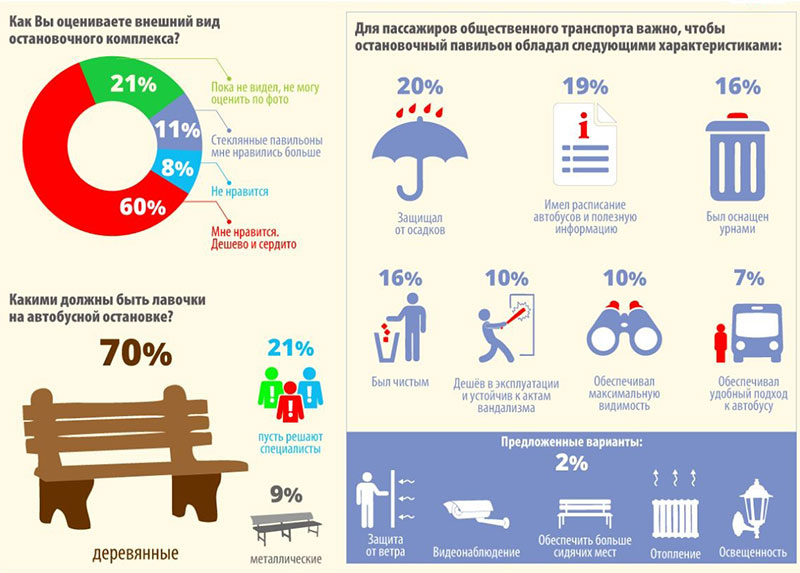 Всего в городе представлено два типа остановок: антивандальные и рассчитанные на маршруты с большим пассажиропотоком. В обоих случаях остекление уступило пластику. Также опрос показал, что горожане предпочитают деревянные сидения.