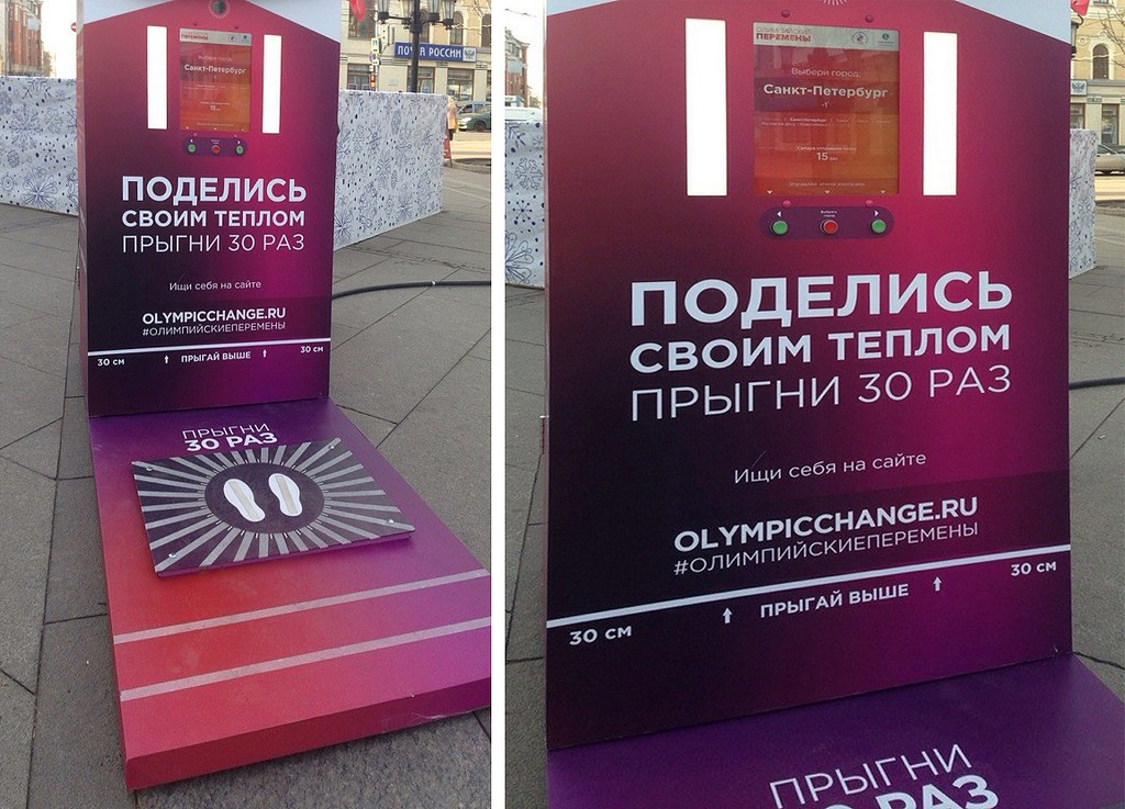 В Екатеринбурге, Казани, Москве, Новосибирске, Омске, Ростове-на-Дону, Самаре, Санкт-Петербурге, Томске и Уфе появились уличные автоматы, предлагающие поделиться теплом с согражданами из других населенных пунктов. Делиться теплом предлагается в самом прямом смысле — путем выработки кинетической энергии посредством физической активности.