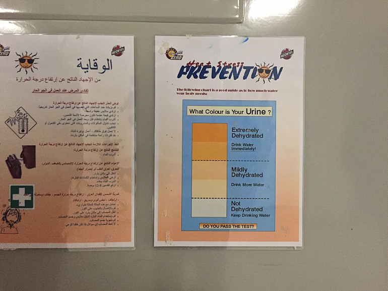 Строители на объекте обязаны постоянно пить воду. В качестве напоминания развешены плакаты, которые рассказывают, как по цвету мочи определить степень обезвоженности организма. Заботятся не только о людях, но и о строительной технике. Бурильно-крановая машина, обложенная искусственным льдом для защиты от перегрева здесь обычное явление.