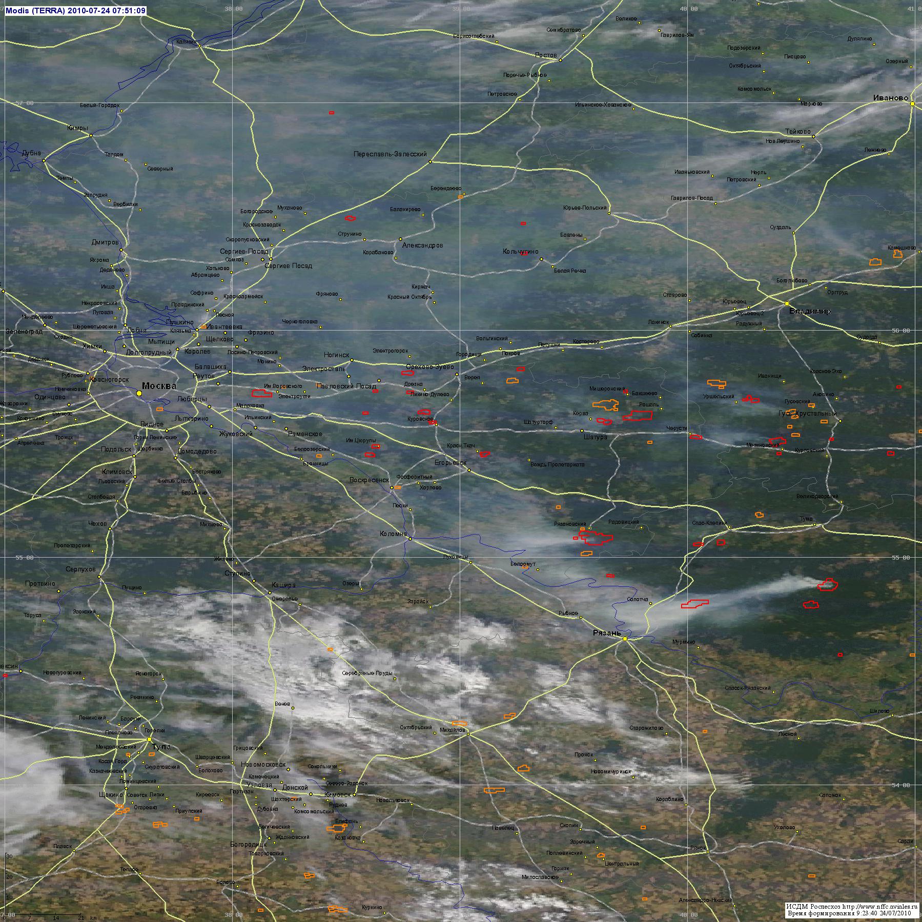 | Распространение лесных пожаров, июль 2010. Спутниковое изображение ИСДМ Рослесхоз |