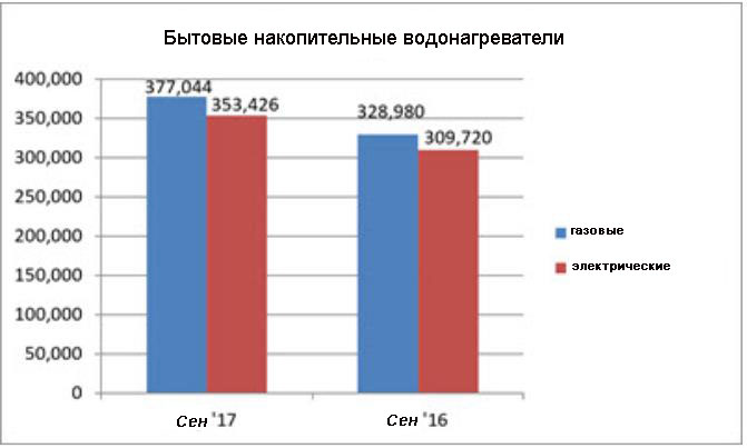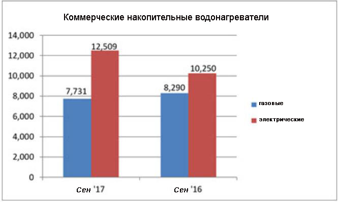 Исходя из анализа представленных данных, можно сделать вывод, что наибольшими темпами в начале осени в Америке росли продажи электрических водонагревателей. Если в бытовом сегменте прирост поставок в сравнении с аналогичным периодом прошлого года для электрических и газовых водонагревателей был практически одинаковым: 14,1% и 14,6% соответственно, то в коммерческом, поставки газовых водонагревателей продемонстрировали отрицательную динамику: -5,7% к уровню прошлого года, в то время, как для электрических водонагревателей этот показатель вырос сразу на 14,8%.
