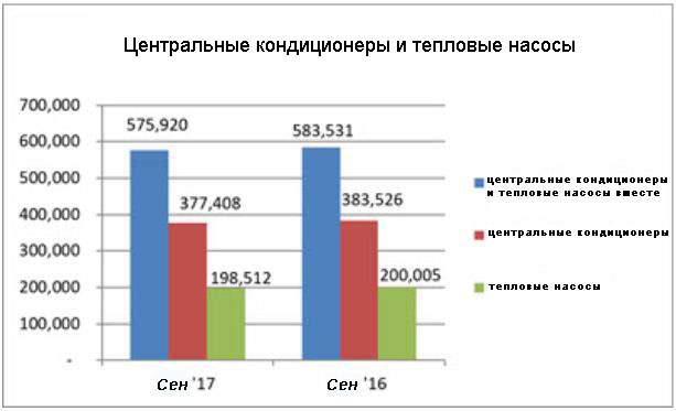 Иная картина наблюдалась в категории «центральные кондиционеры и тепловые насосы» - здесь на американском рынке происходит спад по всем товарам, входящим в данную группу. Правда, величина этого спада незначительна: максимальное снижение оказалось в группе товаров «центральные кондиционеры»: -1,6% к сентябрю прошлого года.