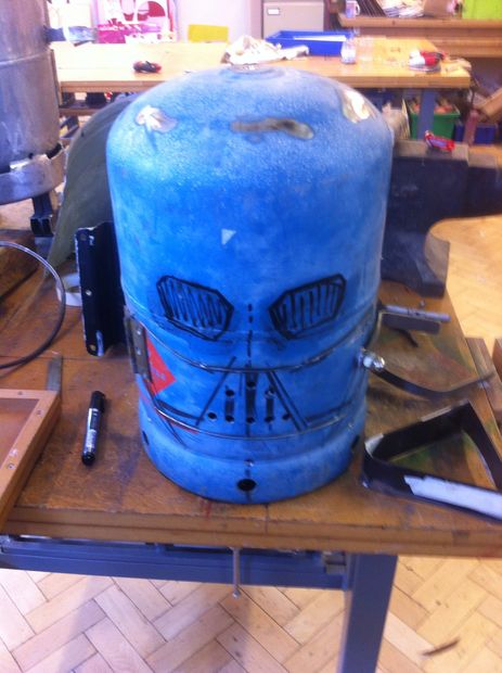 Нарисуйте маркером на баллоне черты «лица» Дарта Вейдера. Найдите ненужные куски металла и сделайте из них шлем.