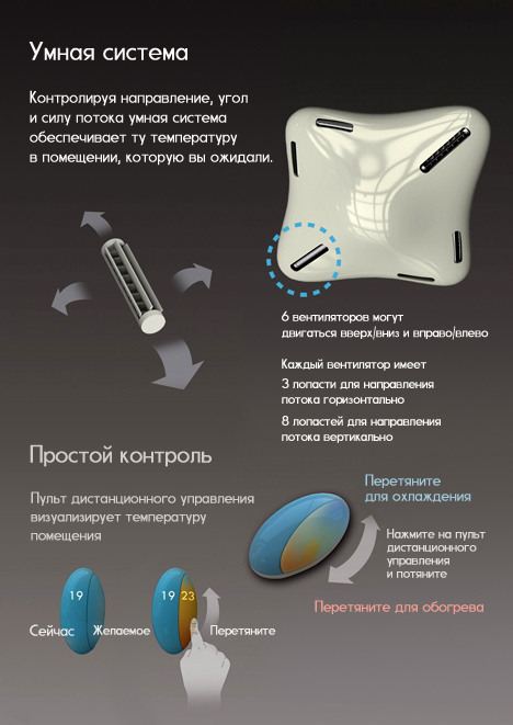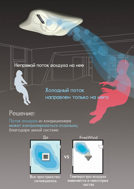 Теперь эта проблема решена. Благодаря тому, что FreeWind подвешивается не на стену, а под потолок, потоки воздуха могут распространяться в разные стороны. А умная система контроля, определяя направление, угол и силу «ветра» позволяет устанавливать свою температуру для каждого участка помещения отдельно.