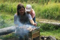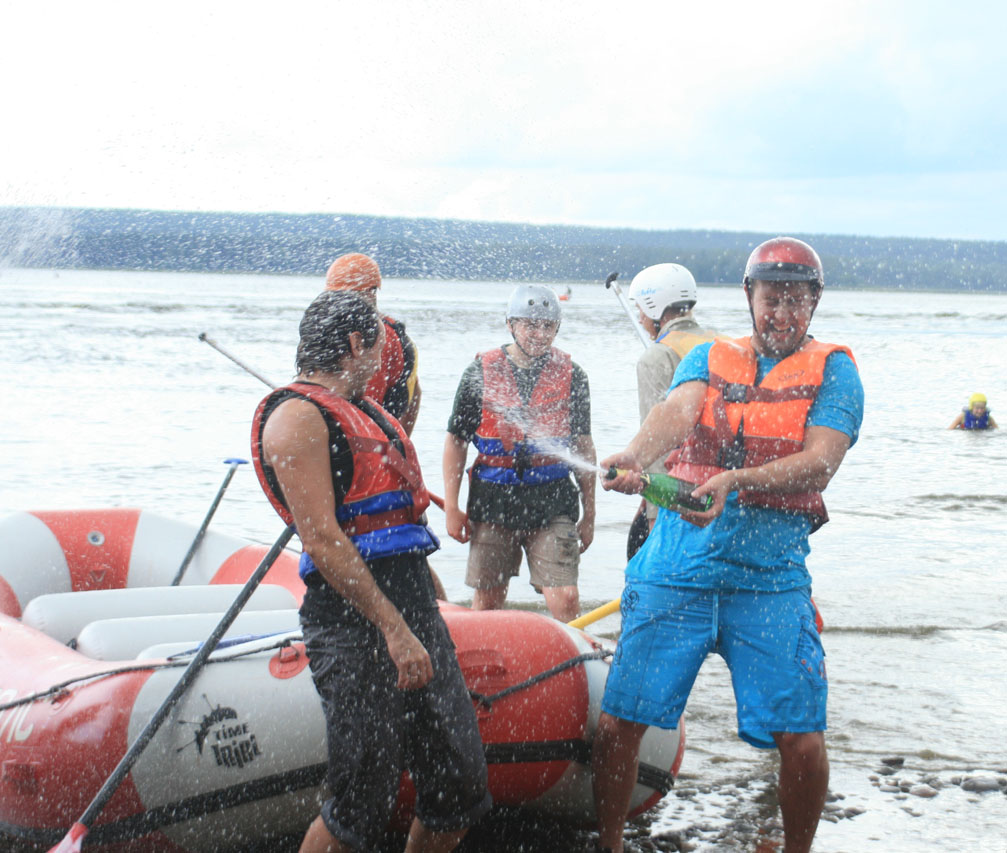 Вдоволь наплававшись на рафтах, коллектив отправился обсыхать к уютному костру, накрытому столу и мангалу с шашлыком. Те, кому показалось мало водных приключений, купались в озере. Предпочитающие сушу играли в диск, волейбол или просто фотографировали всё подряд - каждому нашлось занятие по вкусу.