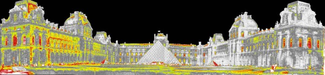 | Лувр в инфракрасном спектре. Парижская достопримечательность теряет тепло из каждой щели за исключением стеклянной пирамиды, построенной в 1989 году. |