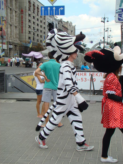На Майдане снова жарко. Это не содержание перехваченной шифровки, а констатация факта. Максим — аниматор и внутри костюма огромной зебры испытал это на своей полосатой «шкуре». Он такой не один. Мики-маусы, пингвины, ослики Иа-Иа покорно бредут по раскаленной мостовой как по сковороде. Толстые костюмы за считанные минуты превращаются в духовку. Время от времени, Максим снимает «голову» и обливается водой или просто заливает живительную влагу в зебру через пасть. «Внутри — жарко, как в сауне. У меня опять появилась крапивница», — задирает рубаху бедняга.