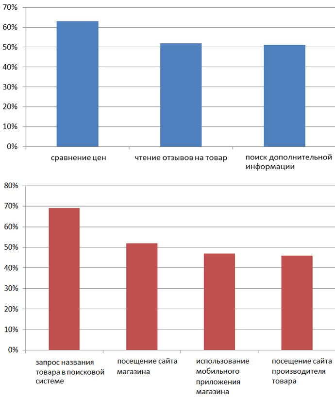 Большинство (62%) считает, что информация из Сети более полезна и точна, чем технические характеристики в каталоге или на дисплее магазина. «Мобильные устройства значительно сместили поведение людей во время шоппинга, — считает Стив Кениг, руководитель отдела аналитики отрасли CEA, — Ритейлеры все больше понимают важность максимального информирования потребителя и личные мобильные устройства покупателей — важная часть этого паззла».