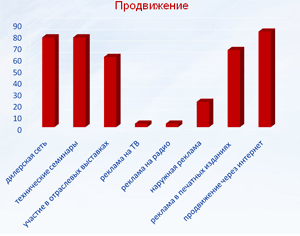 Наиболее популярными методами продвижения являются технические семинары для специалистов, продвижение оборудования через дилерскую сеть, реклама в печатных изданиях, и конечно, интернет.