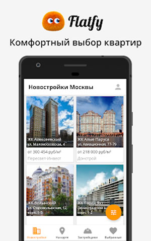 Мобильное приложение Новостройки Flatfy.ru работает на устройствах на Android, что делает выбор новостроек еще более удобным и приятным занятием.
