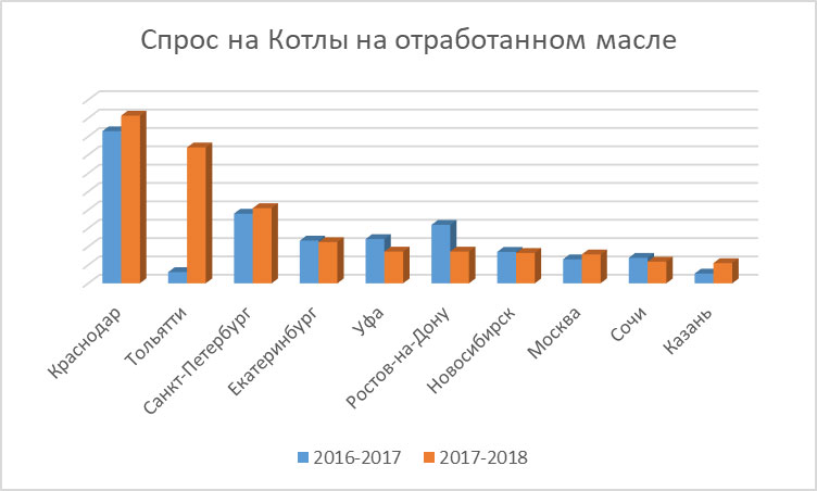Как видно, на каждой из диаграмм лидер неизменно один - Краснодар. Отметим также резкий всплеск интереса к Котлам на отработанном масле в Тольятти, случившийся этой зимой. Остальные выводы читатель может сделать самостоятельно.