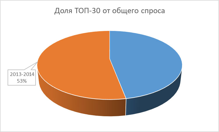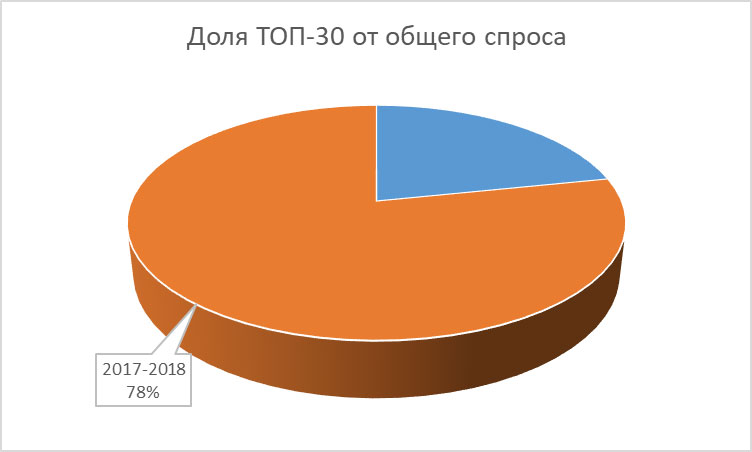 Всего в разделе «Отопление» портала TopClimat.ru представлено около 90 категорий оборудования. На первом этапе исследования были выделены 30 наиболее посещаемых категорий отопительного оборудования. Если 5 лет назад, зимой 2013-2014 гг, на долю этих 30 категорий пришлось 53% от общего числа посещений раздела «Отопление», то в эту зиму данный показатель увеличился до отметки 78,24%. Причем, тенденция к его росту обозначилась уже зимой 2014-2015 гг, когда значение сразу превысило 73%.
