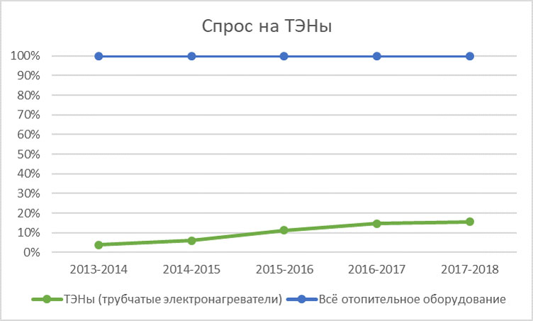Если взглянуть на диаграмму Топ-10 категорий отопительного оборудования, то можно заметить, что разные категории оборудования в разные зимы проявили себя по-разному. Если в первые две зимы наибольшим спросом у посетителей пользовались котлы отопления, то, начиная с зимы 2015-2016 вперед уверенно вырвались ТЭНы. Причем, со все более заметным опережением год от года. Этой зимой их доля в общей структуре спроса на решения по отоплению составила почти 15%.