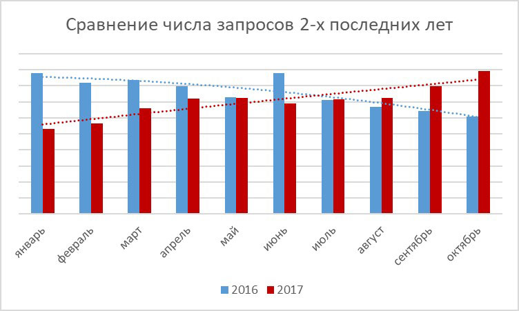 В текущем году спад по числу запросов на портале TopClimat.ru пошел на убыль, что дает основания говорить о стабилизации рынка и питает надежды на его рост в будущем году. На графике можно заметить положительный тренд 2017-го года и отрицательный - 2016-го (показаны пунктиром соответствующего цвета).