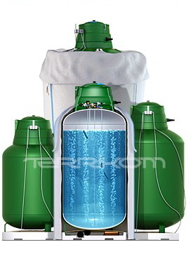 Два редуктора, установленные в резервуарах «Антонио Мерлони», позволяют не зависеть от степени наполнения ёмкости газом: давление остаётся стабильным до полного опорожнения газгольдера. «Шляпа» из ПНД (полиэтилена низкого давления) газгольдера полностью герметична благодаря специальной прокладке, а вентиляция осуществляется посредством обратного клапана. Комплектно поставляется бетонно-щелочное основание (плита изготовлена и установлена на заводе в Италии), которому не страшны нагрузки, подземные наводящие электрические токи и кислотно-щелочная среда.