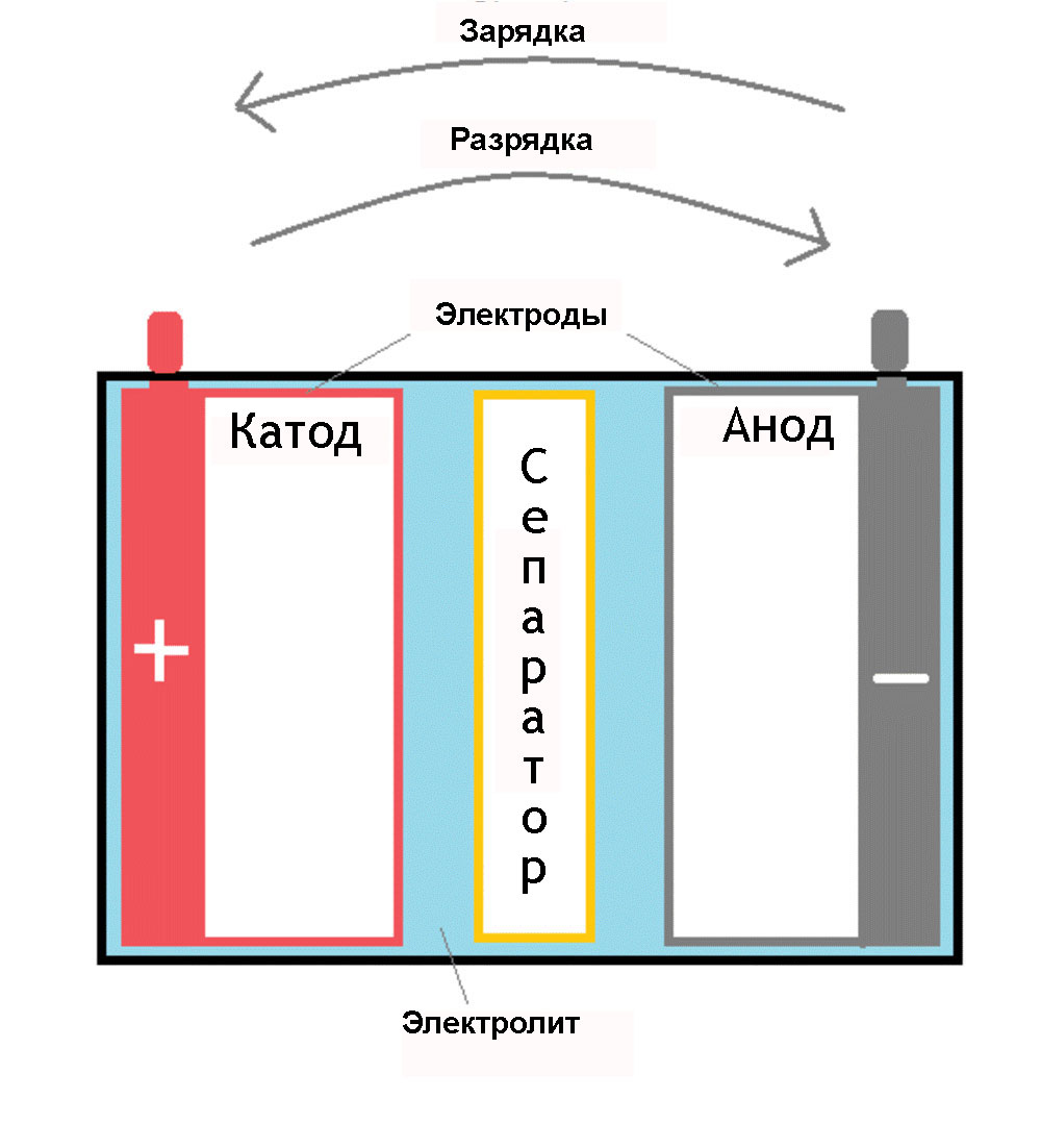В любой батарее всегда есть два электрода: катод подключен к положительному полюсу, а анод - к отрицательному полюсу. Когда аккумулятор питает нагрузку, он разряжается, и ток течет от катода к аноду. Т.е. в аккумуляторах, в отличие от, к примеру, полупроводниковых приборов, катод является положительно заряженным, если этот аккумулятор сам выступает как источник тока. Но все меняется, когда аккумулятор заряжается или сам выполняет роль нагрузки. В этом случае ток течет от положительного анода к ставшему отрицательным катоду. Эта перемена создает некоторую путаницу, о которой следует помнить.